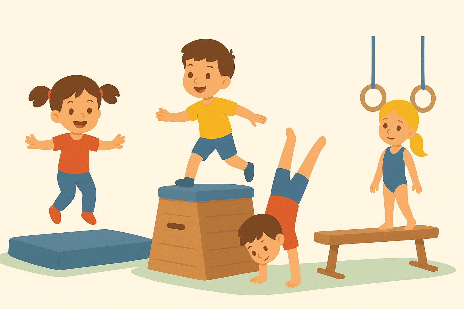 - Wöchentlicher Wechsel der Geräte: Ringe, Trampolin, Balken, Reck etc.
